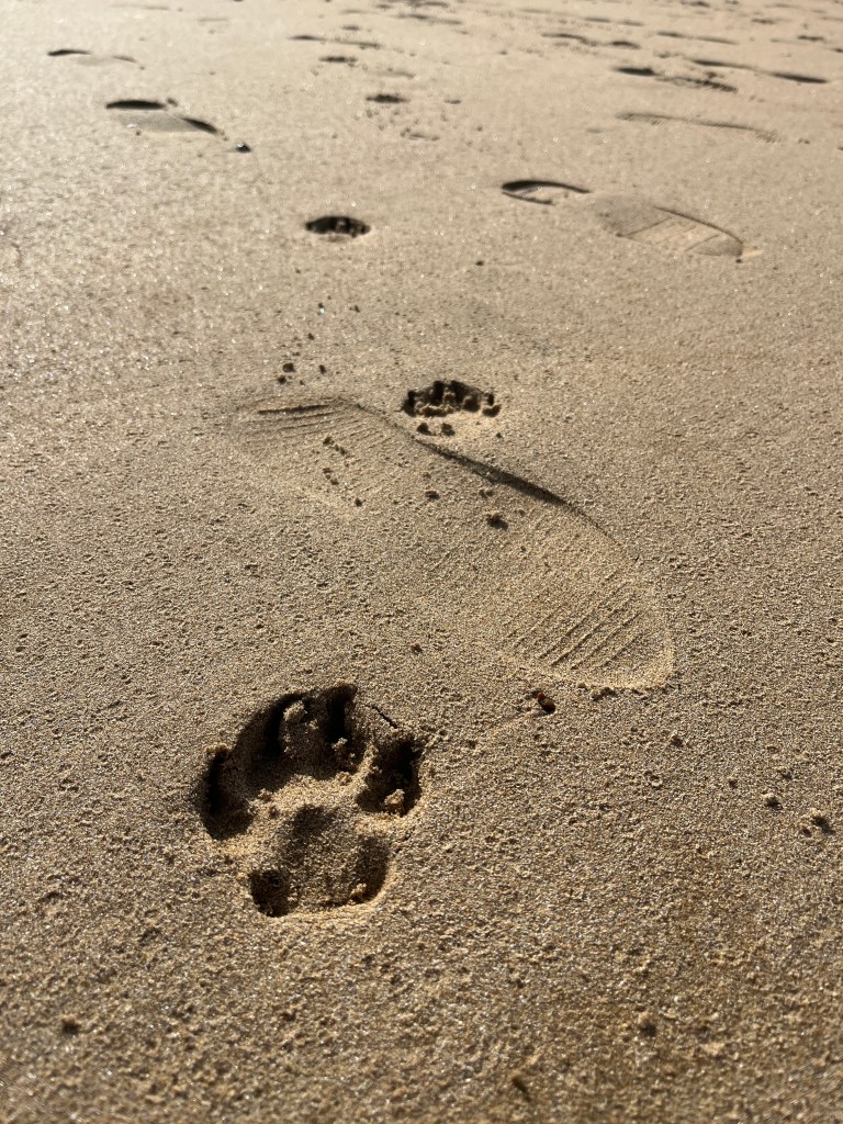 さっきの足跡をつくったのが どんなワンちゃんだったのか想像してるよ